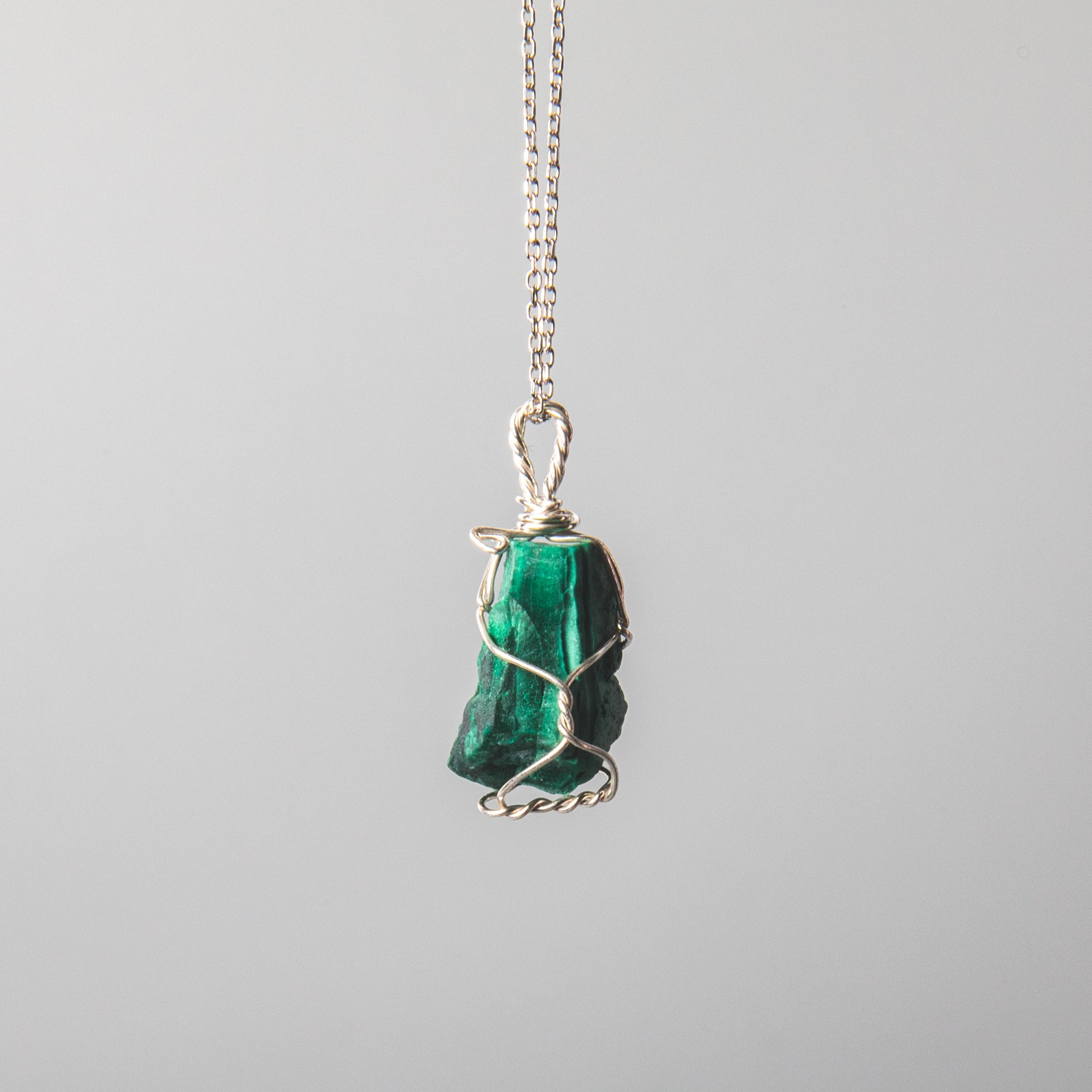 Rohe Malachit-Halskette, mit Silberdraht umwickelt